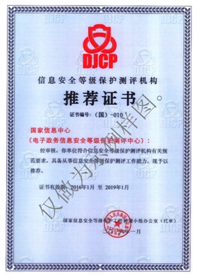 2016年1月,经公安部审核、国家信息安全等级保护工作协调小组批准,国家信息中心(电子政务信息安全等级保护测评中心)获颁“信息安全等级保护测评机构推荐证书”(证书编号:国-010),获准在全国范围内开展信息安全等级保护测评工作。